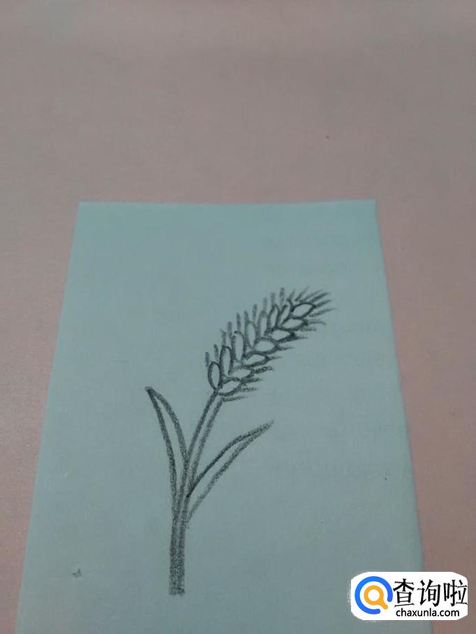 在麦杆的两侧,各画两条相交的弧线,表示叶子,到此,线条就画完了。
