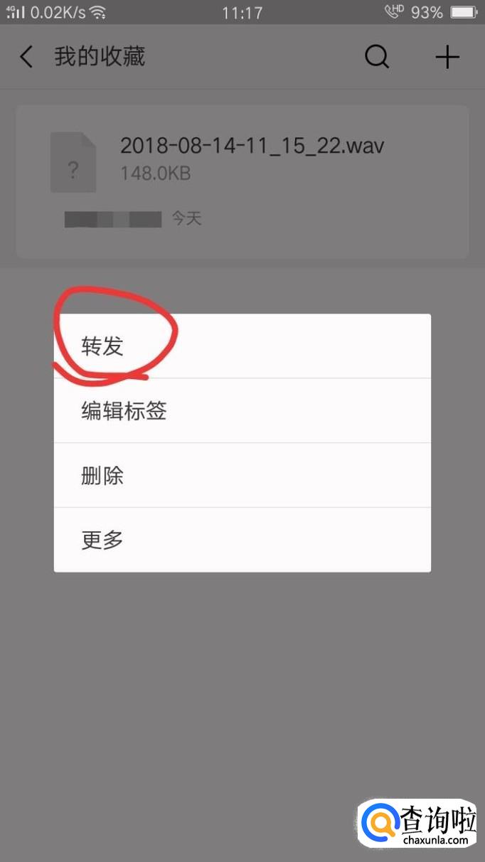 长按收藏的音频文件,点击转发,这样就可以发送给微信好友了。