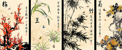 梅兰竹菊指梅花、兰花、竹、菊花。被人称为“四君子”。品质分别是:傲、幽、坚、淡。梅、兰、竹、菊成为中国人感物喻志的象征,也是咏物诗和文人画中常见的题材,号称花中四君子。