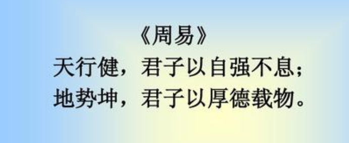 “天行健,君子以自强不息;地势坤,君子以厚德载物”。天(即自然)的运动刚强劲健,相应于此,君子应刚毅坚卓,奋发图强;大地的气势厚实和顺,君子应增厚美德,容载万物。古代中国人认为天地最大,它包容万物。对天地的理解是:天在上,地在下;天为阳,地为阴;天为火,地为土;天性刚,地性柔。