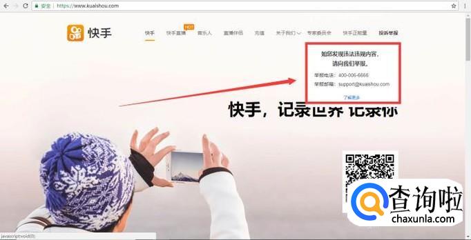 点击进入快手官网,然后点击官网右侧“投诉举报”。可以找到快手邮箱,并复制下来,以备接下来使用。