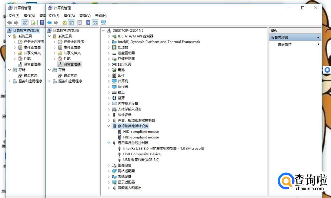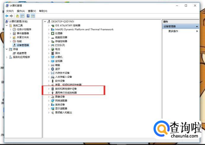 在设备管理器列表中,找到“鼠标和其他指针设备”和“通用串行总线控制”。