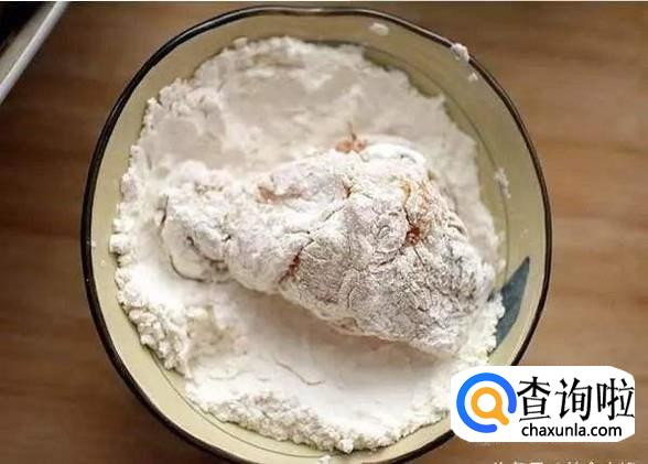 然后为了鸡腿入味我们可以在鸡腿上划伤几刀,用蚝油生抽腌制一下,这样子更加入味,然后我们用炸面粉将鸡腿包裹。
