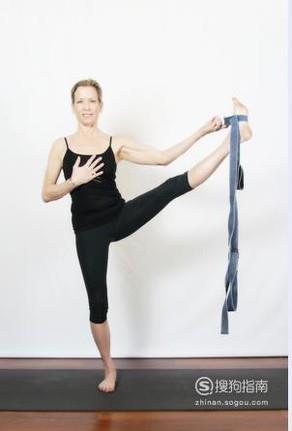 当我们在做瑜伽中的平衡前曲式时,为了帮助我们提高腿部和身体的距离,我们就可以使用瑜伽伸展带来固定我们的位置。