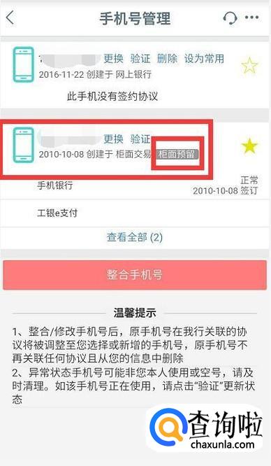 然后就可以看到银行卡绑定的手机号了,手机号旁边会显示柜面预留,就是银行卡绑定的手机号了。