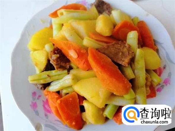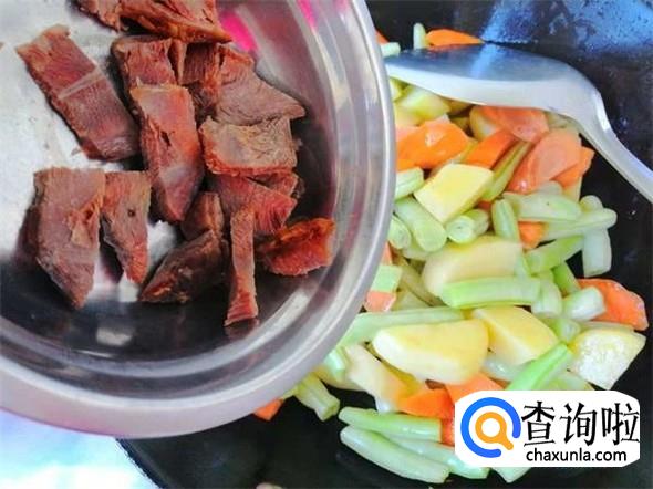 最后再加入我们刚刚切好的熟牛肉放到锅中,让牛肉和土豆,芸豆,胡萝卜一起翻炒。