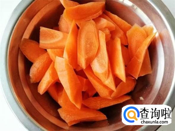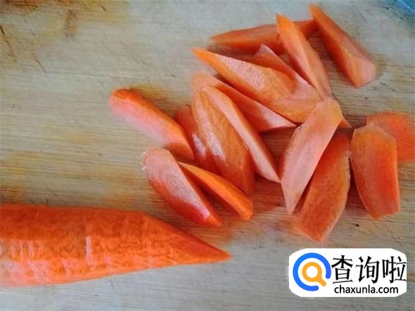 把洗好的胡萝卜放在案板上,用刀切成下图所示的片状,放到碗中做备用。