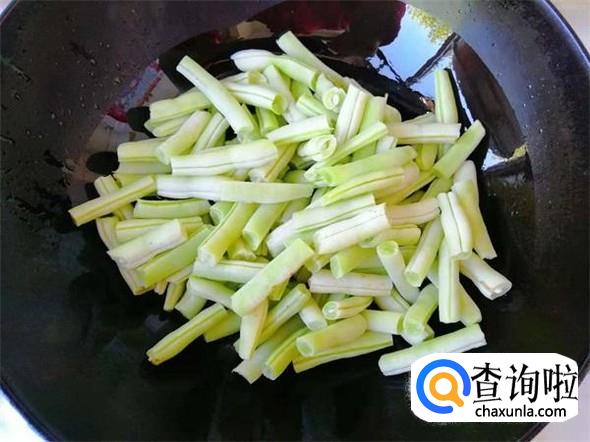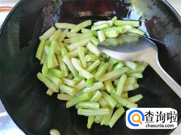 然后开火,冷锅热油,油热以后我们把芸豆先放入锅中翻炒一下,这里注意,我们在放芸豆的时候尽量保持芸豆是控干水的状态,否则可能会出现油四处乱溅的情况。