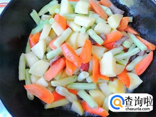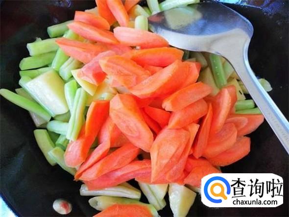 因为胡萝卜是可以生吃的,所以说我们在最后的时候可以再放胡萝卜。把胡萝卜放到锅中和土豆芸豆一起翻炒。