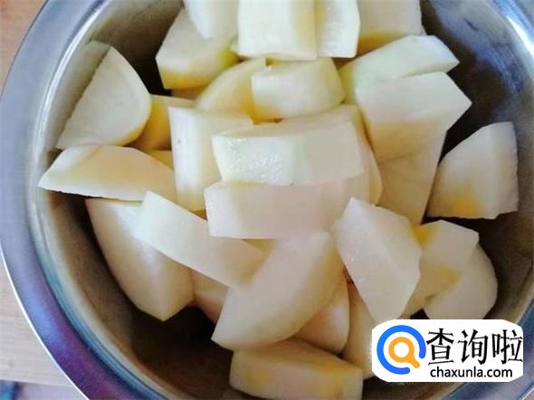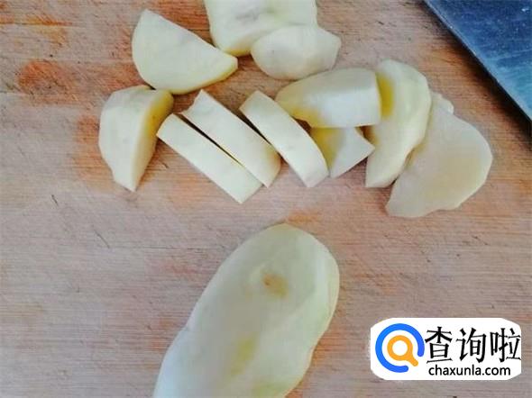 然后把土豆放在案板上将土豆切成土豆块,这里我们可以再把土豆块儿用水清理一遍,去除一下土豆块中的淀粉。