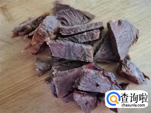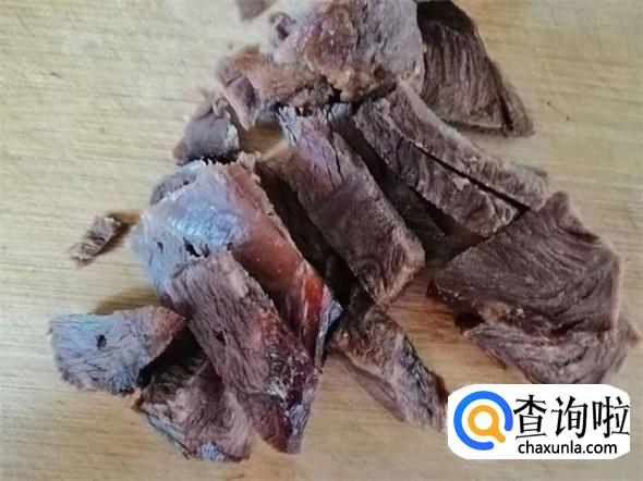然后拿出事先准备好的熟牛肉,把牛肉切成片状。牛肉可以切的稍微厚一点。