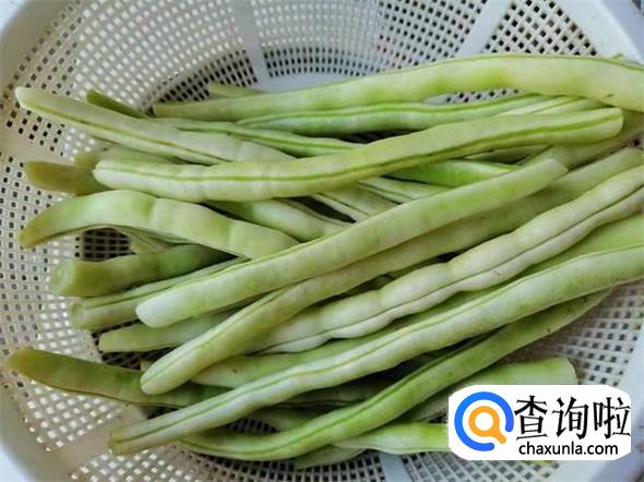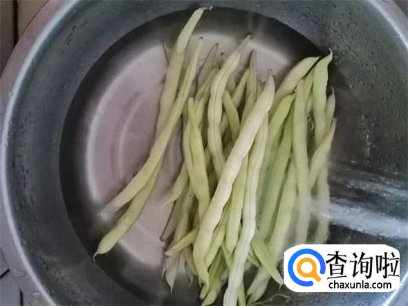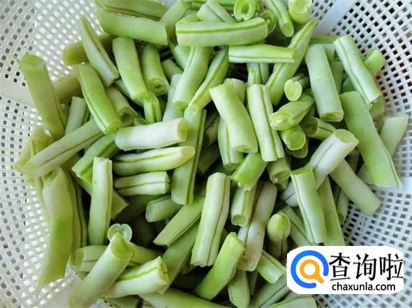 把芸豆清洗干净以后,放到盆中控水,控干净水以后我们把芸豆切成下图所示大小的小段。如果不喜欢吃芸豆丝的话,可以把芸豆的丝也处理干净。