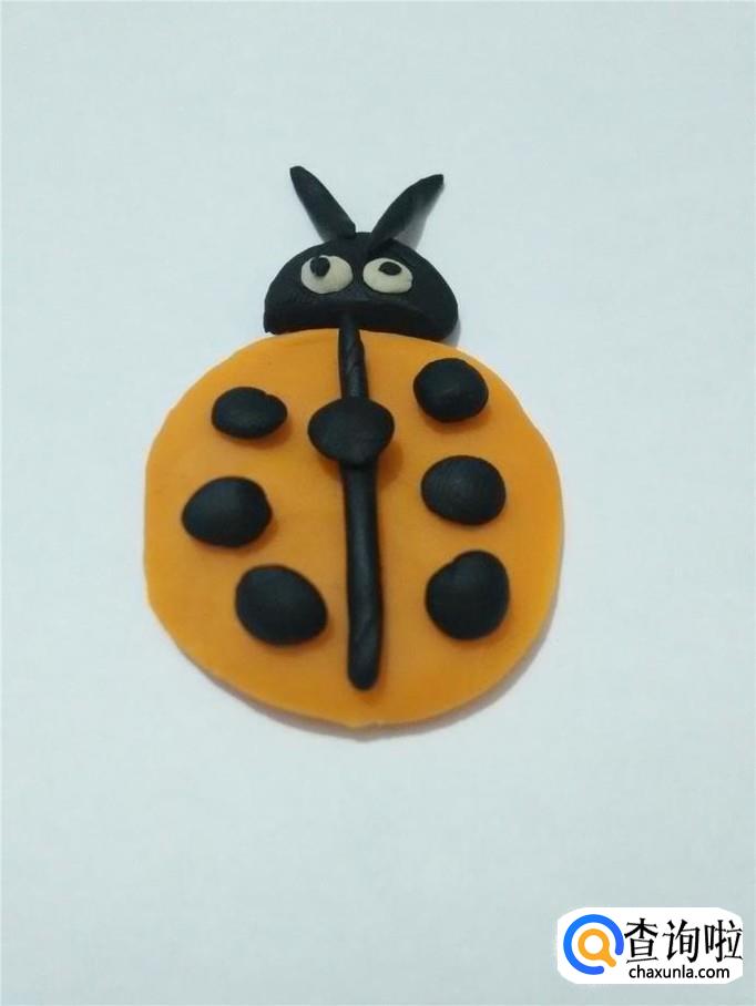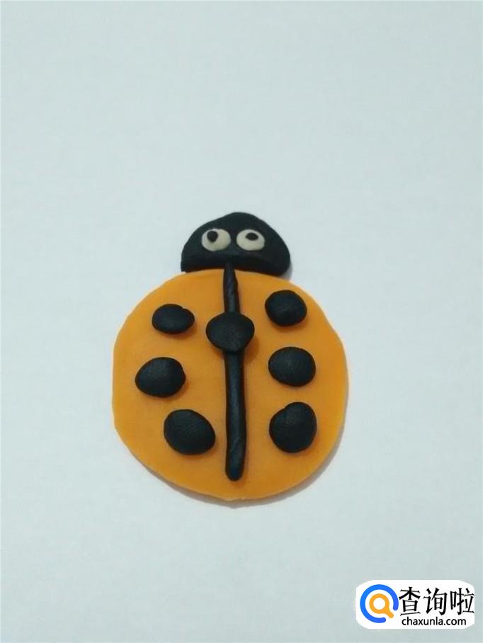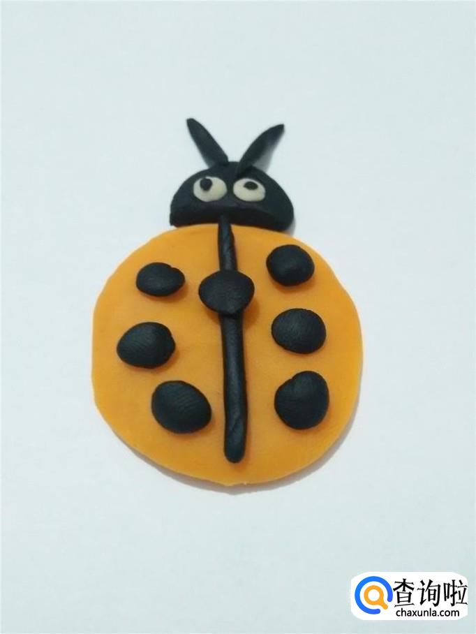 用黑色搓一个细长条,粘在瓢虫背上,当作分开的两只翅膀。