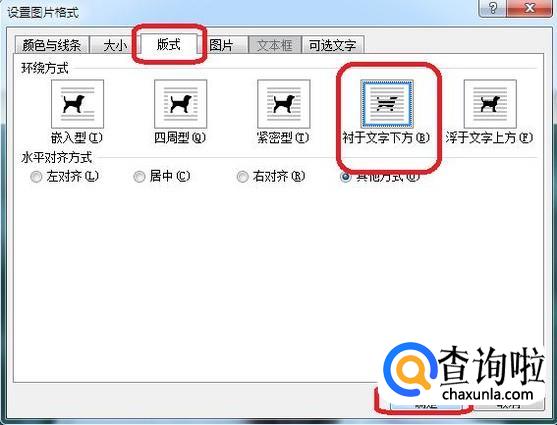 右键点击图片,选择“设置图片格式”,弹出选项框后,点击“版式”,把图片环绕方式改成“衬于文字下方”,点击确定。