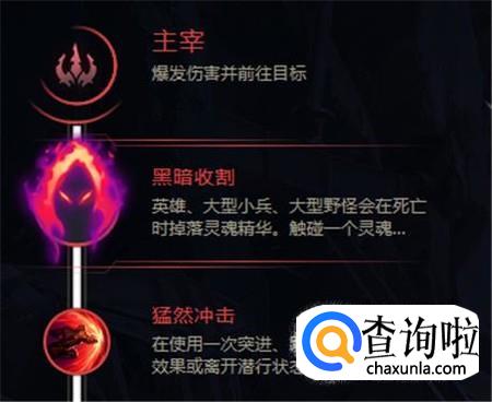 选择黑暗收割,使你的下次攻击造成基于灵魂数的额外自适应伤害,猛然冲击使E技能衔接其他技能时获得穿甲