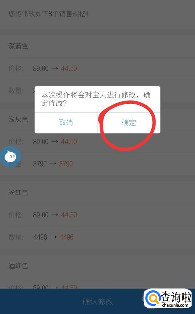 然后点击“确认修改”,会有提示出现:本次操作将会对宝贝进行修改,确认修改?点击确定操作。商品价格就修改成功了。