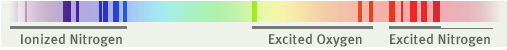 这也是为什么最高的极光总是以红色为主;其下是以氧的绿色为主,辅以氮的红色/蓝色;而再往下,则只会有氮发出的红色或者蓝色极光。