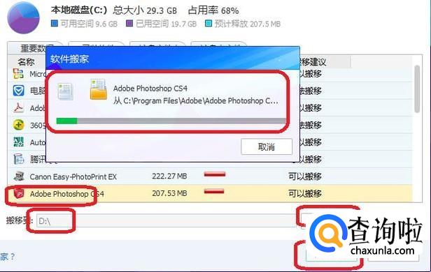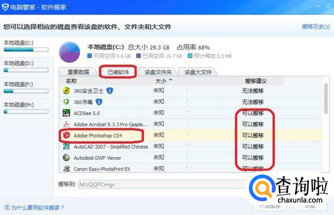 加载完成后,会自动分析可以搬迁的数据和软件,如图所示,我们点击“已装软件”标签,就能看到所有能搬迁的C盘软件了,我们试着搬迁一下PS。