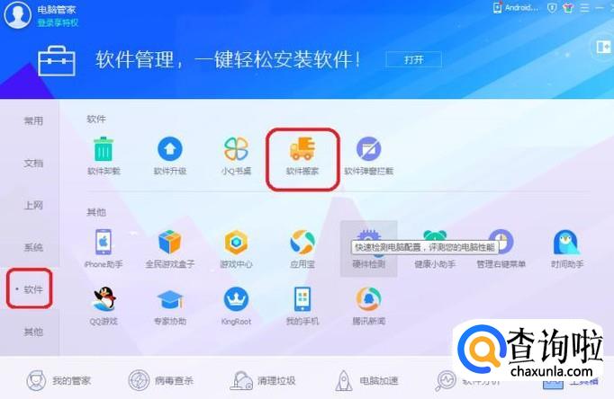 点击左侧栏里的“软件”选项卡,就能看到“软件搬家”功能了,我们点击加载一下。