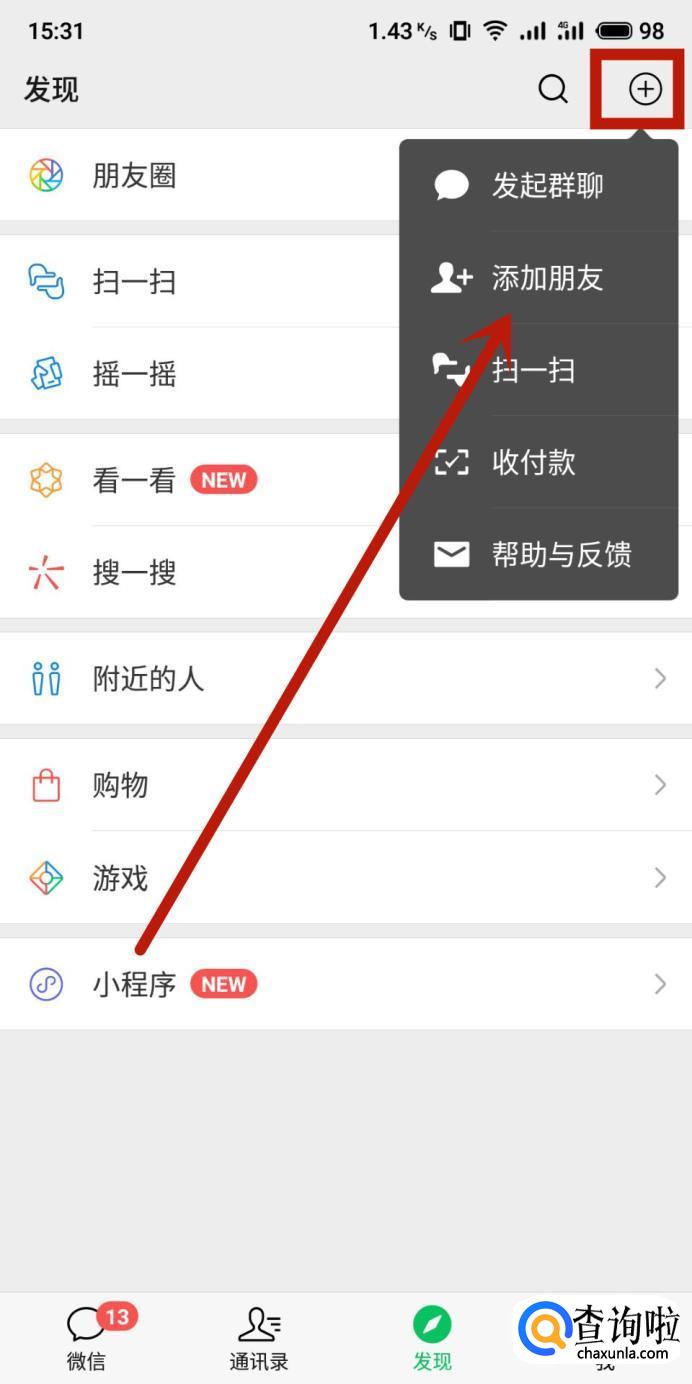 在微信的“发现”页面点击图示位置的“+”,选择“添加朋友”,如图所示。