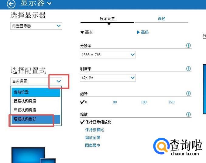 弹出的界面,我们点击当前设置边上的下拉箭头,弹出的界面,我们点击增强视频色彩,这样我们的显示器就不会显得发白了。