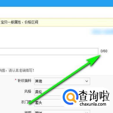 在这里我们可以看到“宝贝标题”这一项,这是一个长的编辑框,编辑框的右侧这里有数值:0/60;左边的0是你当前输入的标题字数;而右边的60表示该标题字数最多是60个字。那么,我们可以知道,一个标题只能输入60个字,这是以汉字来说的,两个数字或是两个英文字母,是以一个汉字来计算。我们在写标题时就不能超过60个字。