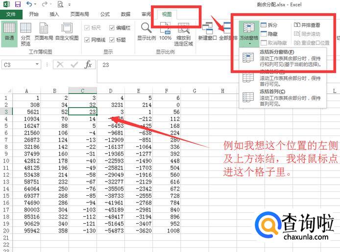 其实意思就是在任意位置冻结,点击“视图”-“冻结窗口”-“冻结拆分窗口”,如下图: