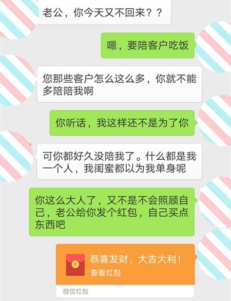 节假日的时候,高明也是一直在忙工作上的事,陪客户吃饭,夜不归宿是常有的事,这样的时候多了,女友难免会有怨言,高明一贯的解决办法就是发红包,可女友想要的是高明的陪伴,高明的做法不仅不曾讨得女友欢心,反而让女友更加没有安全感。