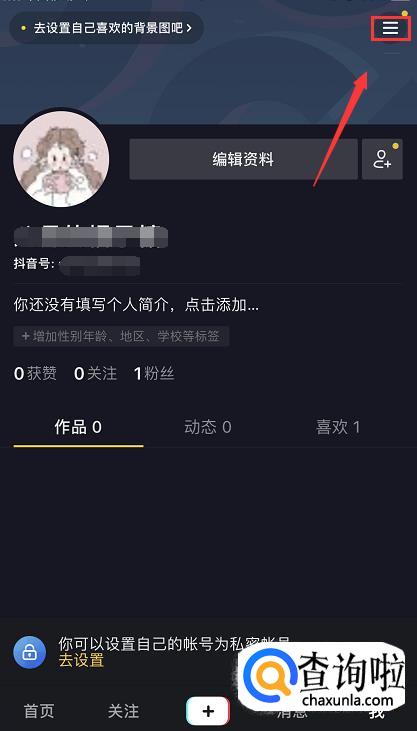 点击之后进入个人页面,在右上角可以看到一个三横符号,点击该符号。