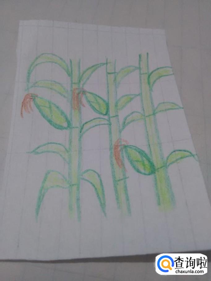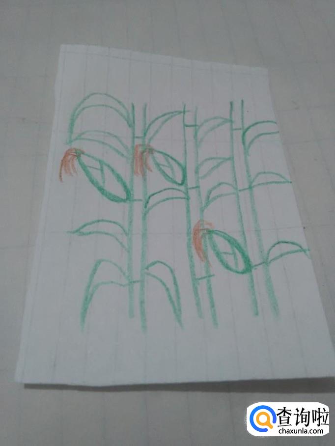 最后用浅绿色将玉米、玉米叶子和玉米杆涂上颜色,几株玉米就画完了。