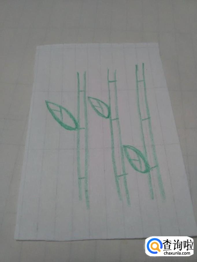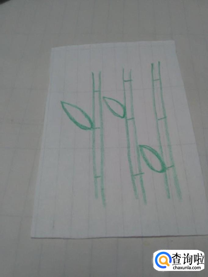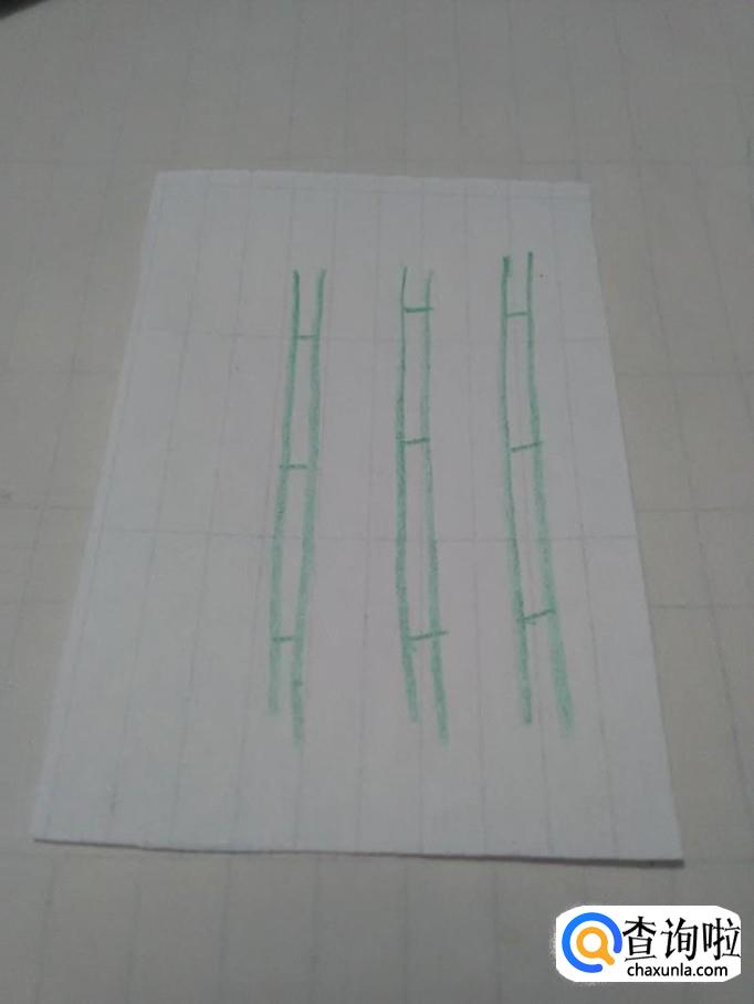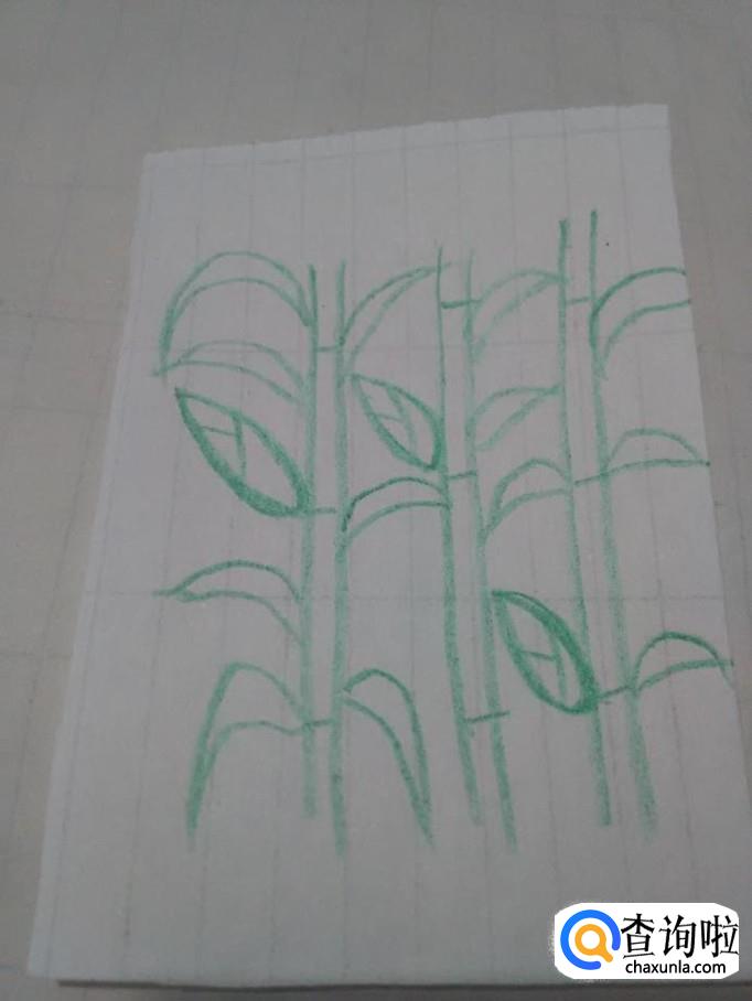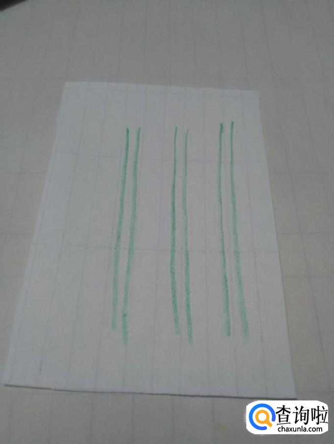 先用深绿色彩笔在纸上画六条直线,每两条直线表示一根玉米杆。