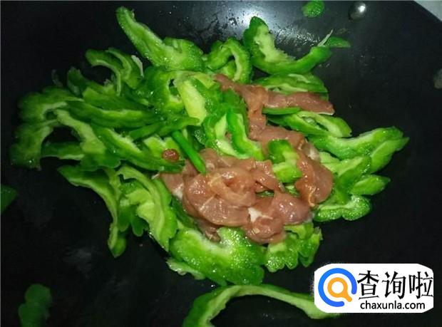 苦瓜翻炒到八成熟,然后倒入腌制好的瘦肉,加入适量的盐和蚝油,大火一直翻炒。