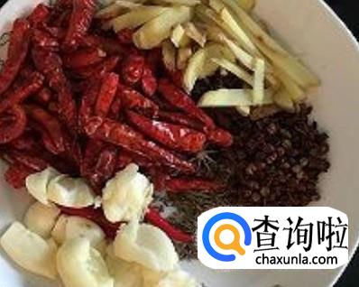 小米辣、蒜米、姜丝、花椒、八角准备好。