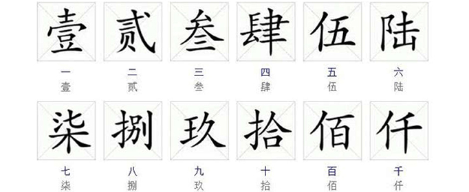 大写数字是和小写数字的读音一样的文字 。不得用一、二(两)、三、四、五、六、七、八、九、十、廿、毛、另(或0)填写,不得自造简化字。如果金额数字书写中使用繁体字,如贰、陆、億、万、圆的,也应受理。在重要场合,有些人根据小写数字容易修改的性质来改写数据,会给人们带来损失,因此创造了大写数字。