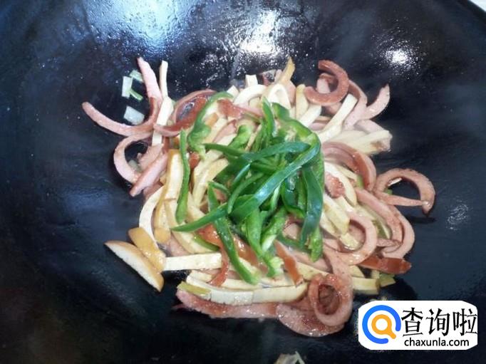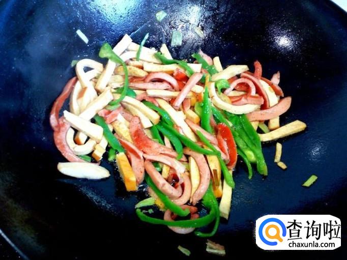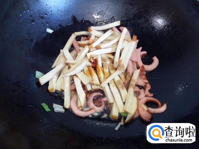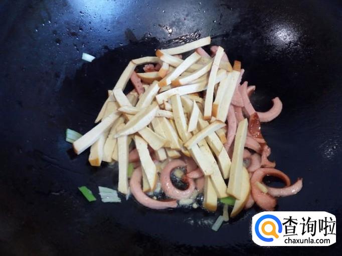 炒至脆皮肠变软,放入素鸡转中火翻炒,放入五香粉,料酒,少许蚝油。放一点水进去,这样炒出来的素鸡比较软。