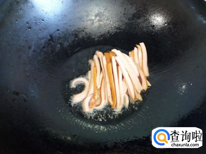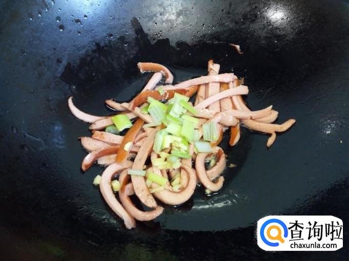 锅里放入油加热,油热后放入脆皮肠小火翻炒,放入葱,姜。
