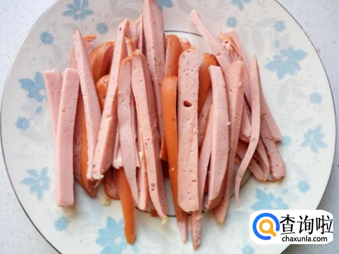 脆皮肠去掉外包装,用刀切成细条。