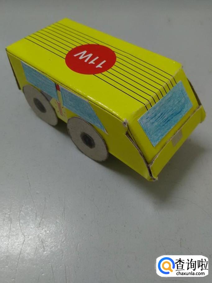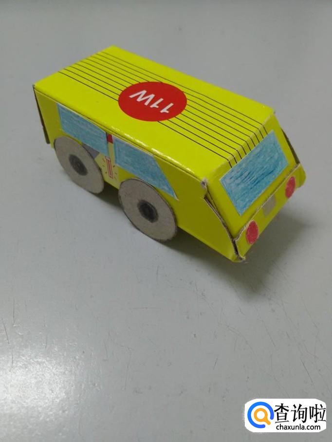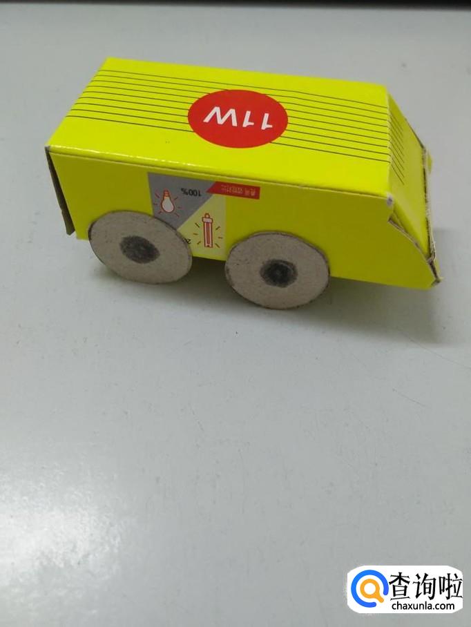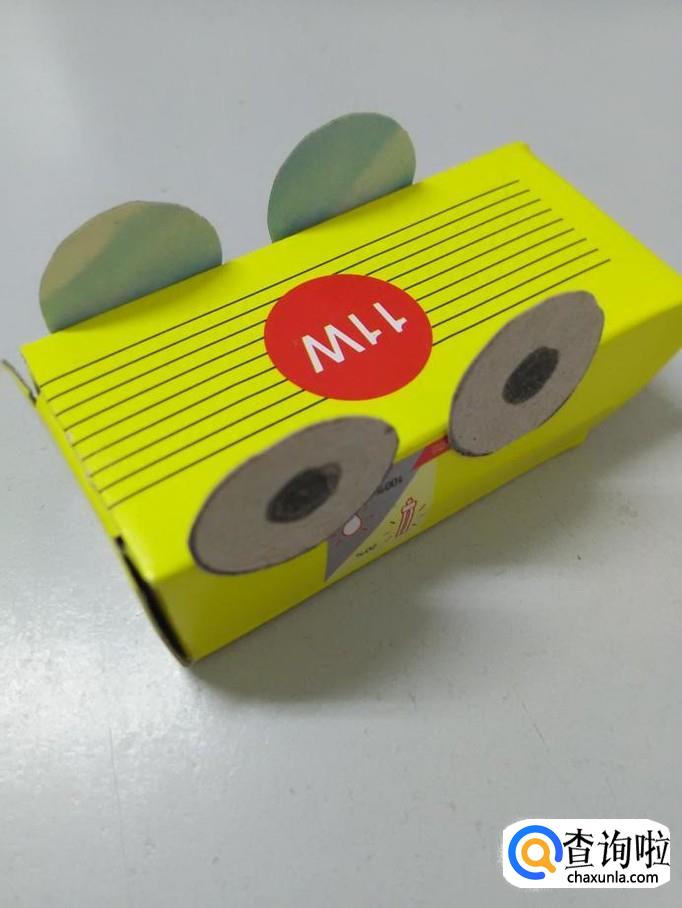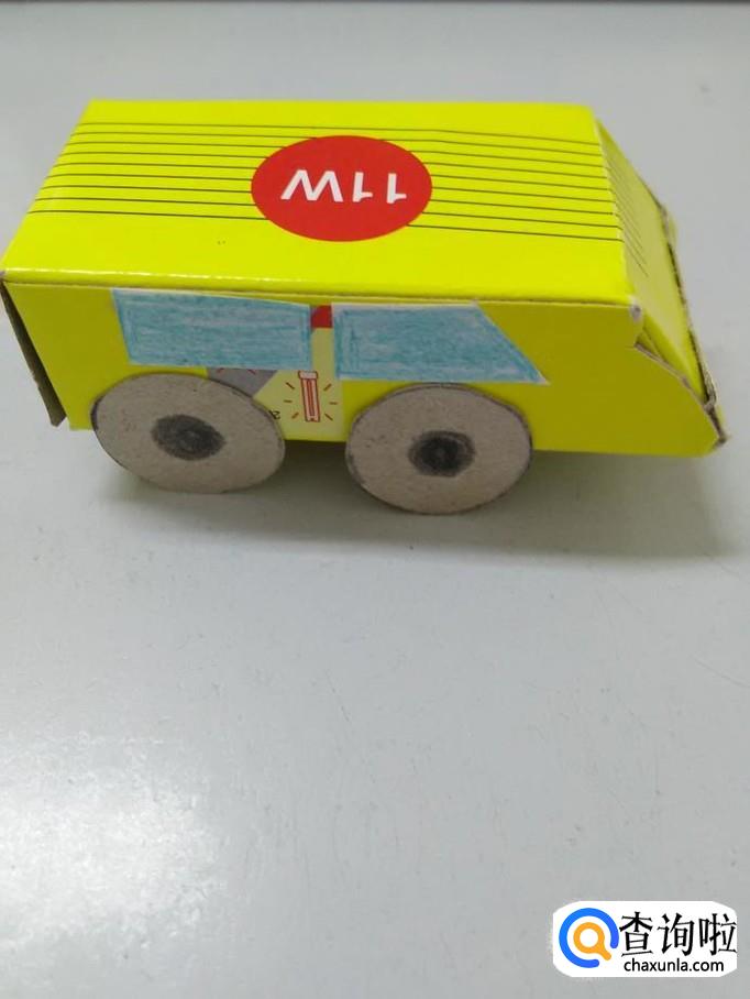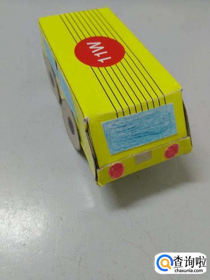 把车灯背面抹上胶棒,粘在车头下方,纸盒小汽车就做好了。