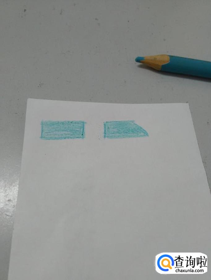 用浅蓝色彩笔在纸上画一个长方形和一个梯形,当作车窗。