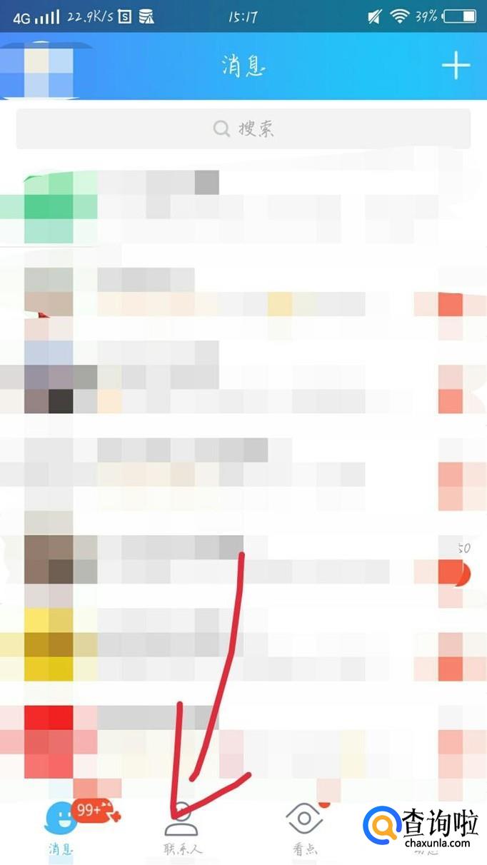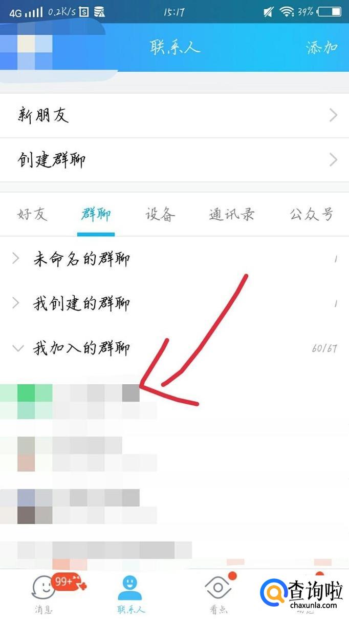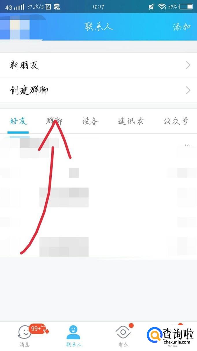 点击下方的“联系人”选项,如图1箭头所示。会出现一个新的界面,点击“群聊”选项,如图2箭头所示。