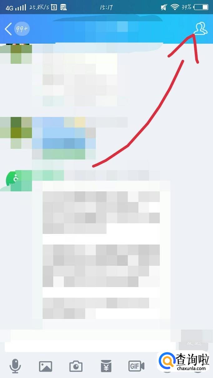点击你想要拉好友进群的那个群,会进入一个新的界面,如图1所示。点击右上角的“人形”选项,如图1箭头所示。