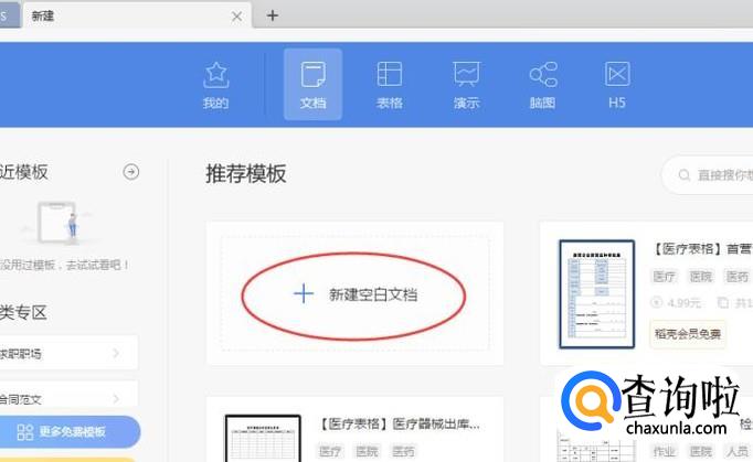 然后点击推荐模板中的【新建空白文档】,如下图所示: