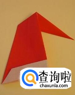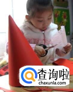 在圆锥的上面折一条斜线,压扁,沿着斜线将圆锥的顶折下来。相当于下垂的冒顶,也可以在冒顶上贴上一点装饰品,这样一顶圣诞帽就完成了。