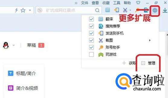 在浏览器首页,地址栏的右侧,找到如图所示的“更多扩展”按钮,点击之后会出现下拉菜单,我们选择点击“管理”按钮。