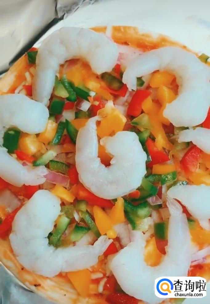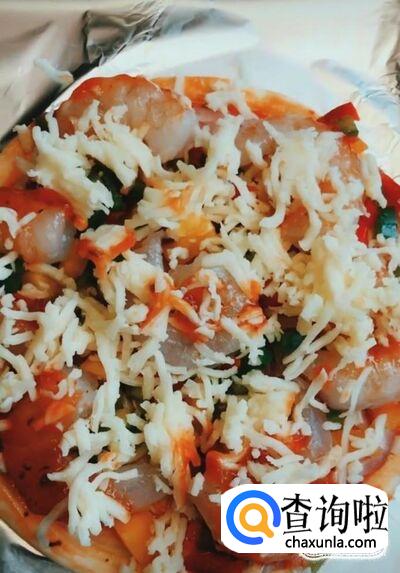 再根据自己的喜好在上面撒上适量的芝士碎,洋葱碎,彩椒碎和几个大虾仁。再在虾仁上刷上一层披萨酱,最后再撒上一层芝士碎。
