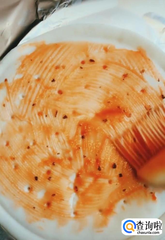 准备一片披萨饼,中间多扎上几个小孔。在披萨饼上均匀的刷上一层披萨酱。