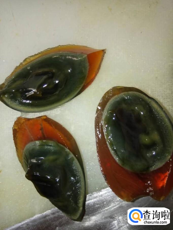 皮蛋的种类其实也有很多,有绿心的、有黄心的,食用哪种皮蛋依据个人的喜好;我们今天吃的是比较常见的绿心的;将皮蛋的壳小心剥掉,一个切成4-6小块,不要切碎了;