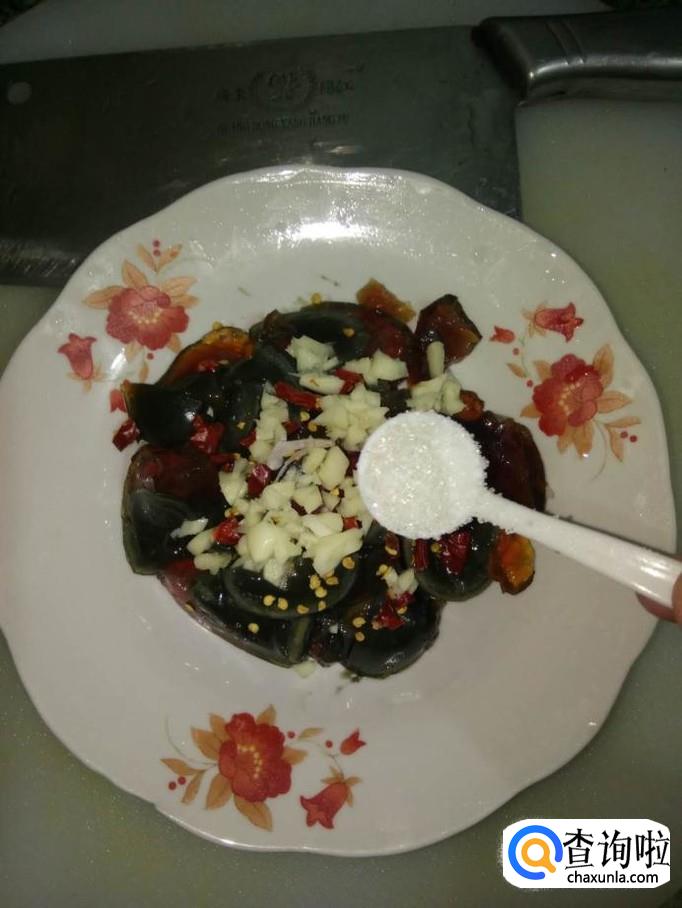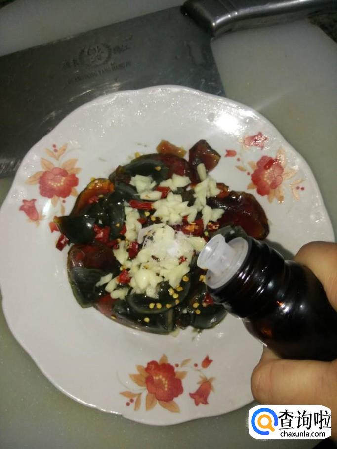 材料:皮蛋 蒜头 干红辣椒 糖 味极鲜酱油 香麻油