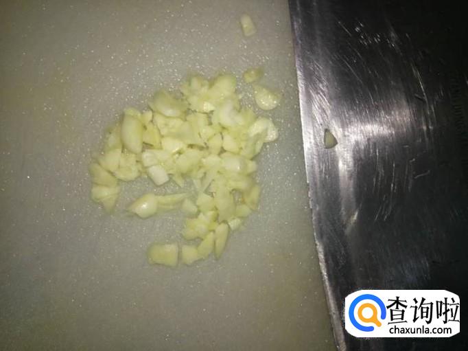 取5-6个蒜头,将蒜头压一压,去膜,清洗一下,再切成蒜末;喜好蒜的味道的可以多备一些蒜头,味道更香;