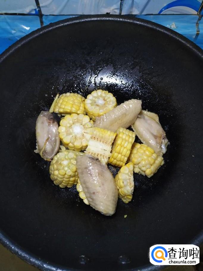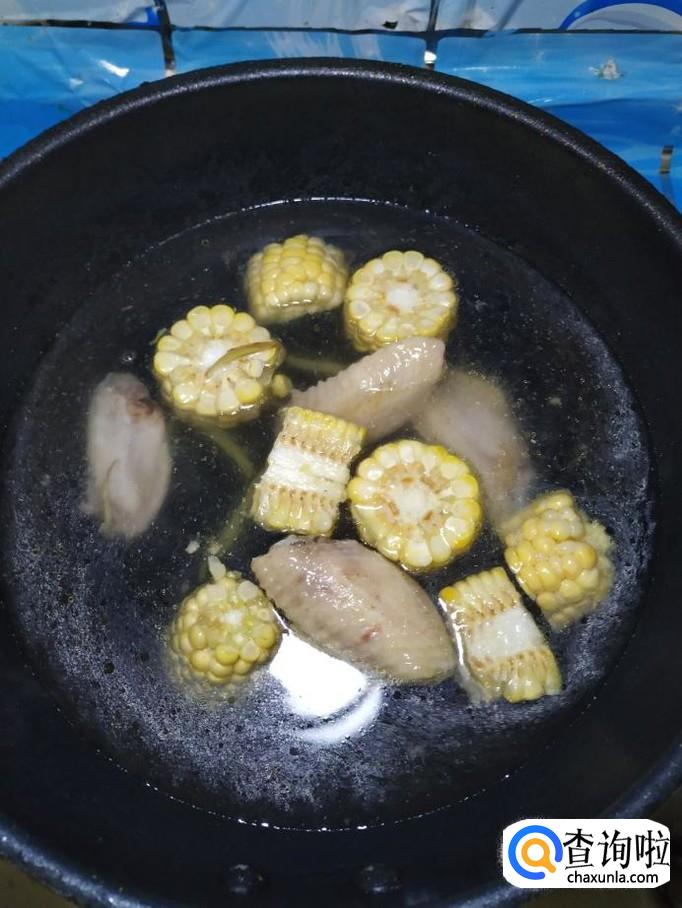 加入适量清水,清水的量,要没过鸡翅和玉米。